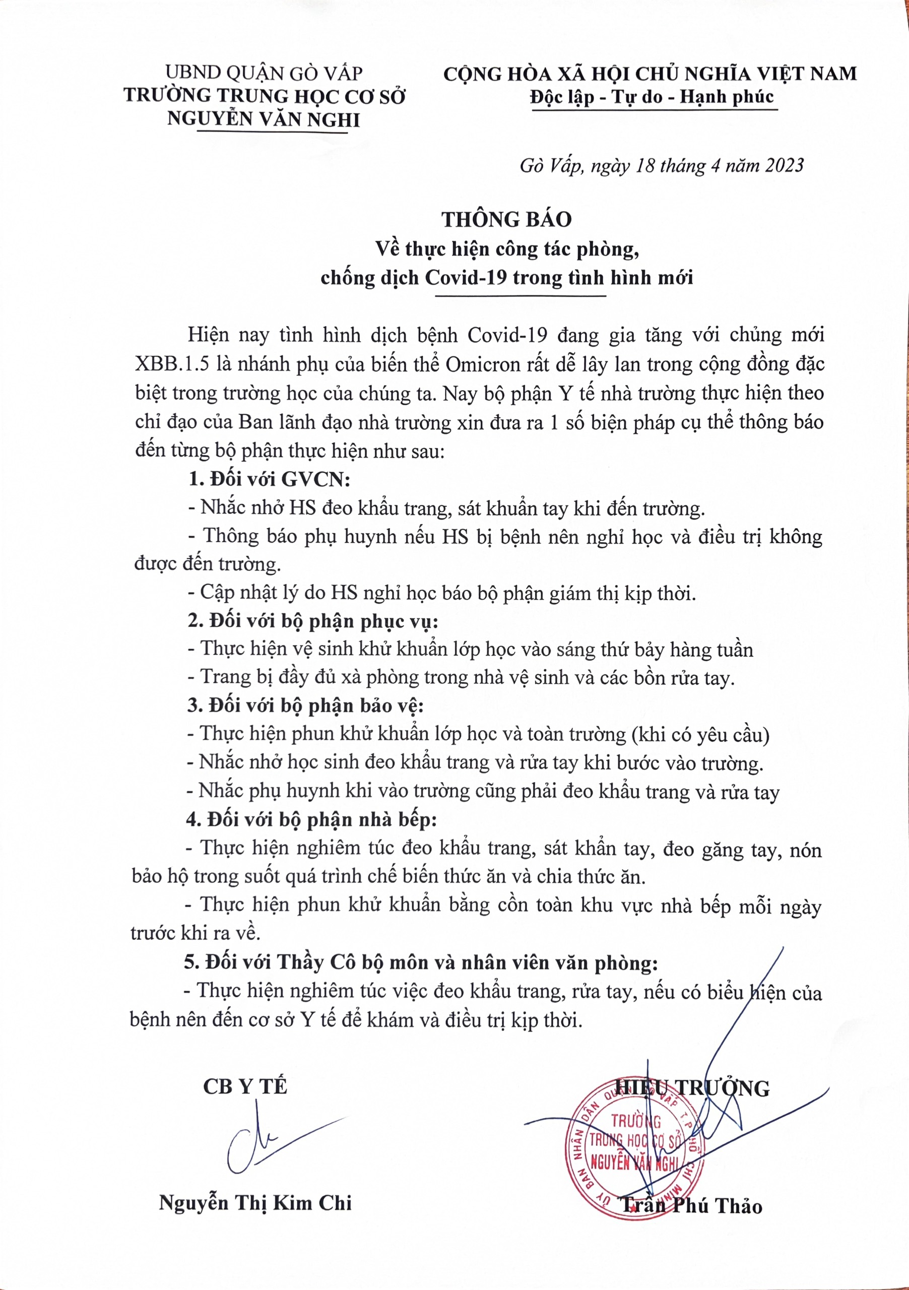 Chuyên mục: THÔNG BÁO Số Văn bản: 378/TB-THCS.NVN Phòng ban: Trường THCS Nguyễn Văn Nghi
