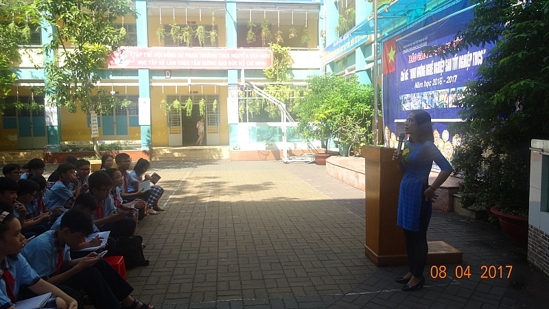 Các em học khối lớp 9 tham dự trong buổi báo cáo nghề nghiệp