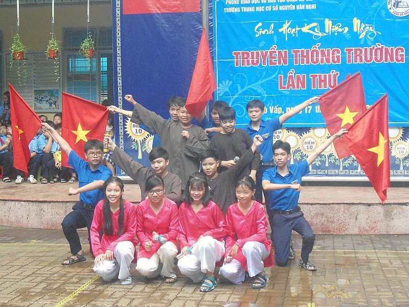 Tiết mục hát múa đầy sôi động của các bạn học sinh lớp 8/1 qua nhạc phẩm “Những trái tim Việt Nam”