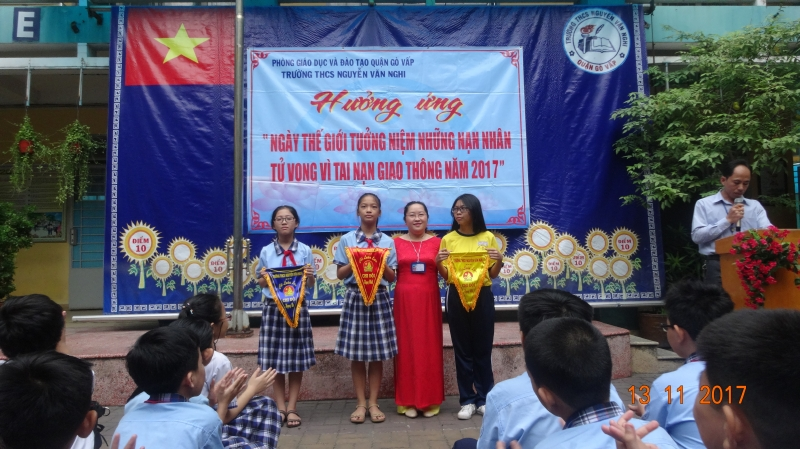 Thầy Nguyễn Văn Hiền , cùng giáo viên và học sinh trường THCS Nguyễn Văn Nghi mạc niệm những nạn nhân tử vong vì tai nạn giao thông.